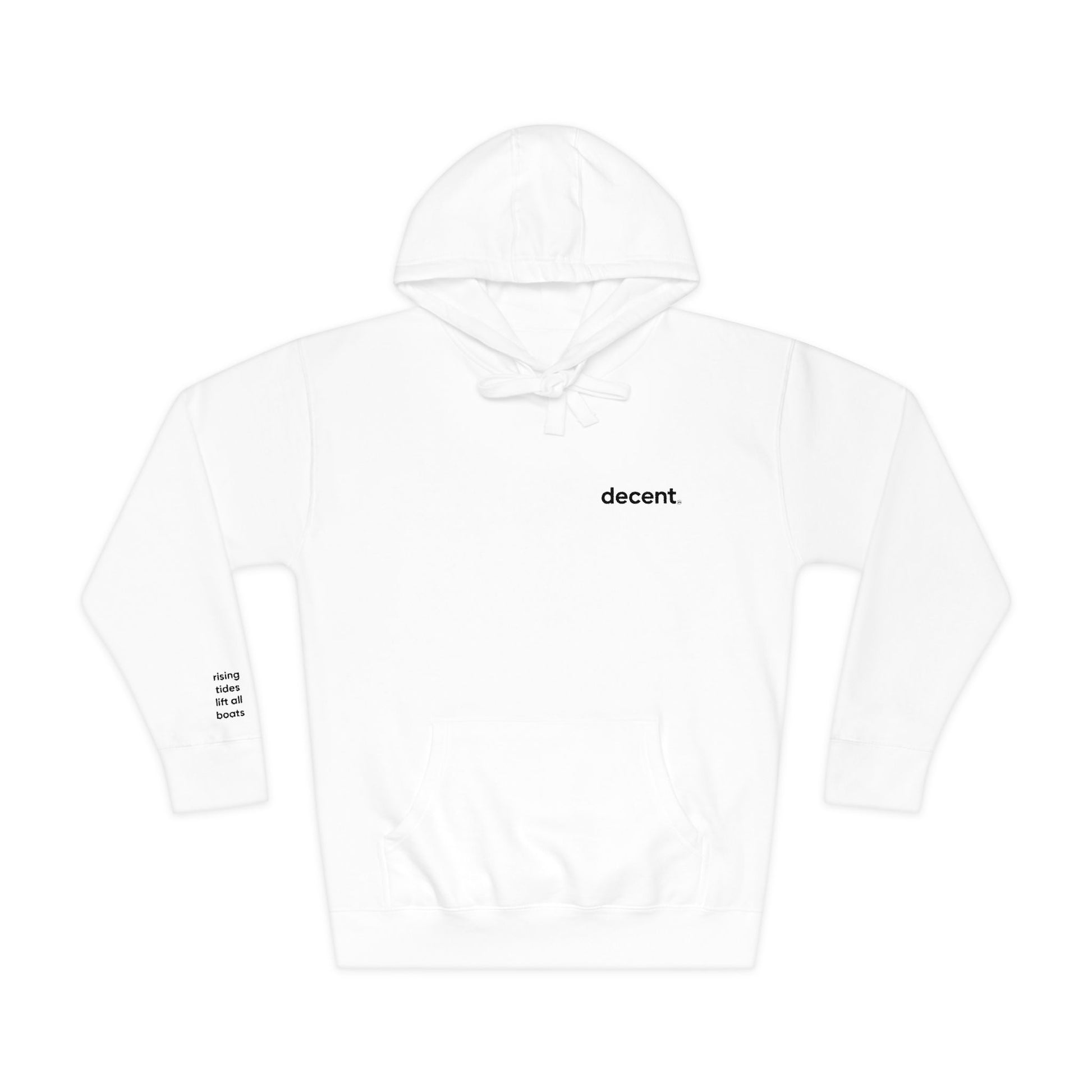 Our fleece hoodie places its mark where it matters — over the heart — with “rising tides lift all boats” printed near the right wrist.